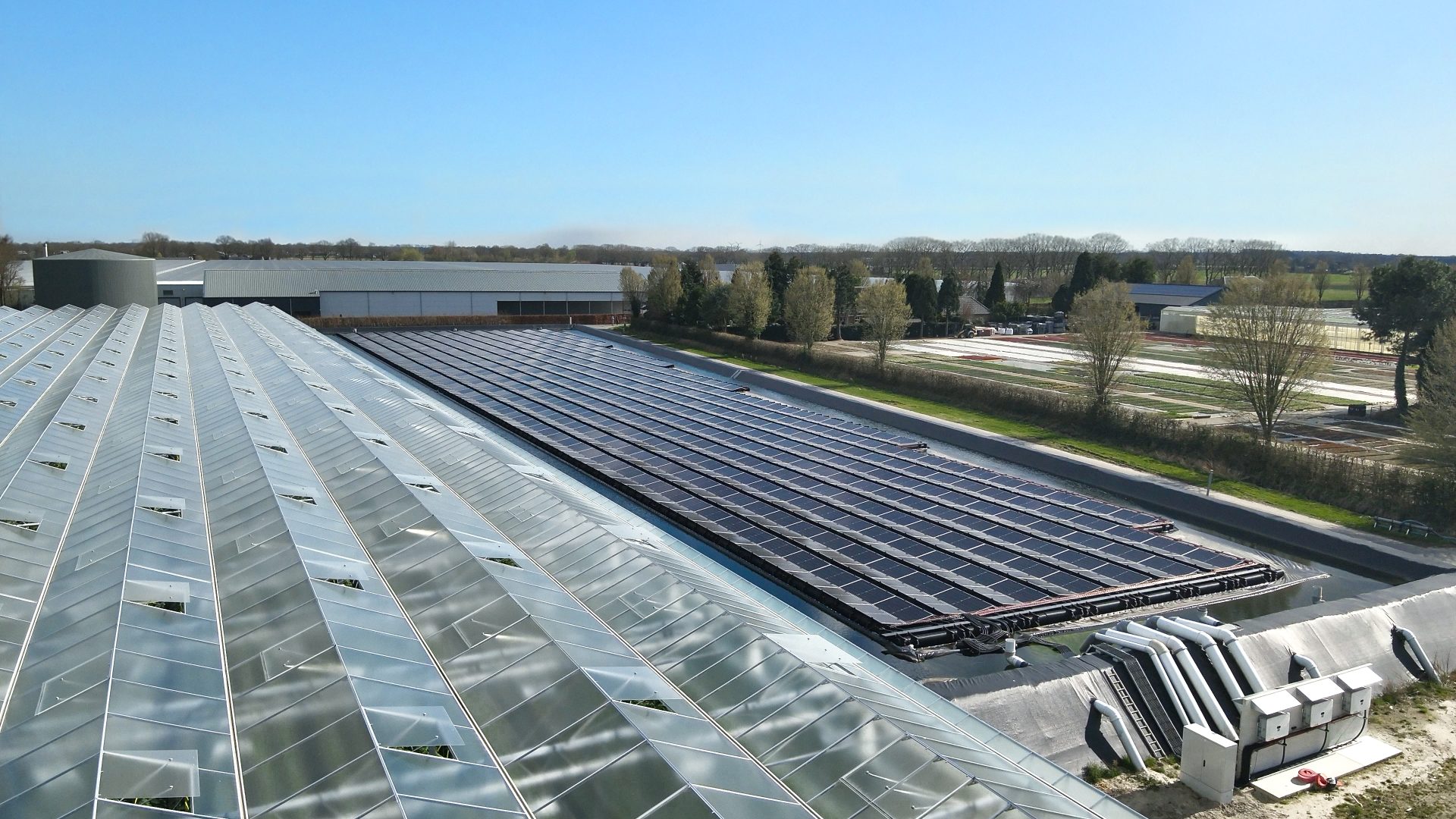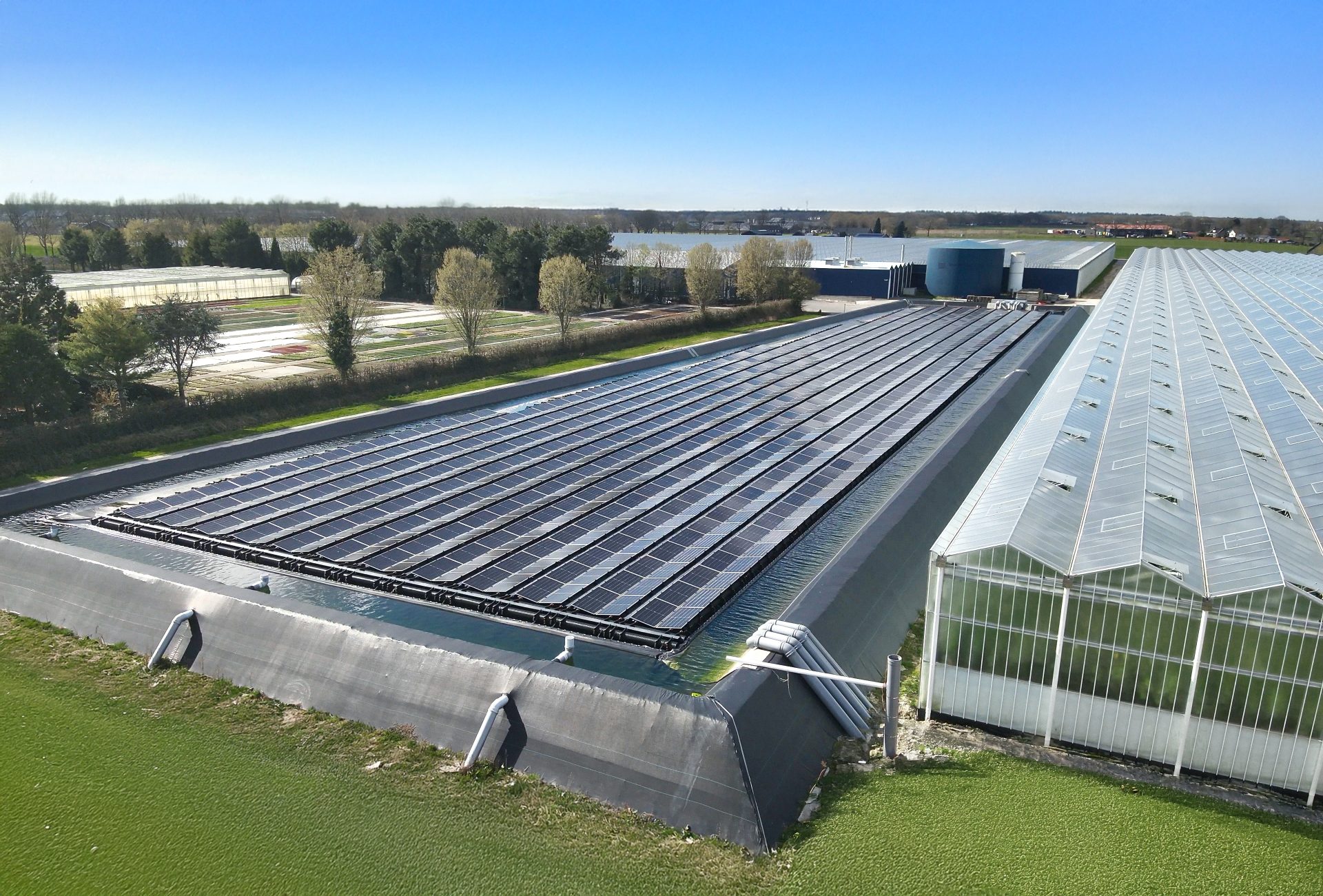 Op het water: 1.254 panelen drijven op het bassin, waar ze profiteren van natuurlijke koeling en geen extra grondoppervlak innemen.